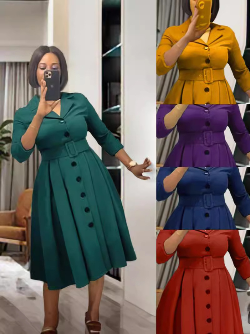 1 Piece New Fashion Casual Women's Solid Color Laps Long Sleeve Multi-button Waist dress Belt