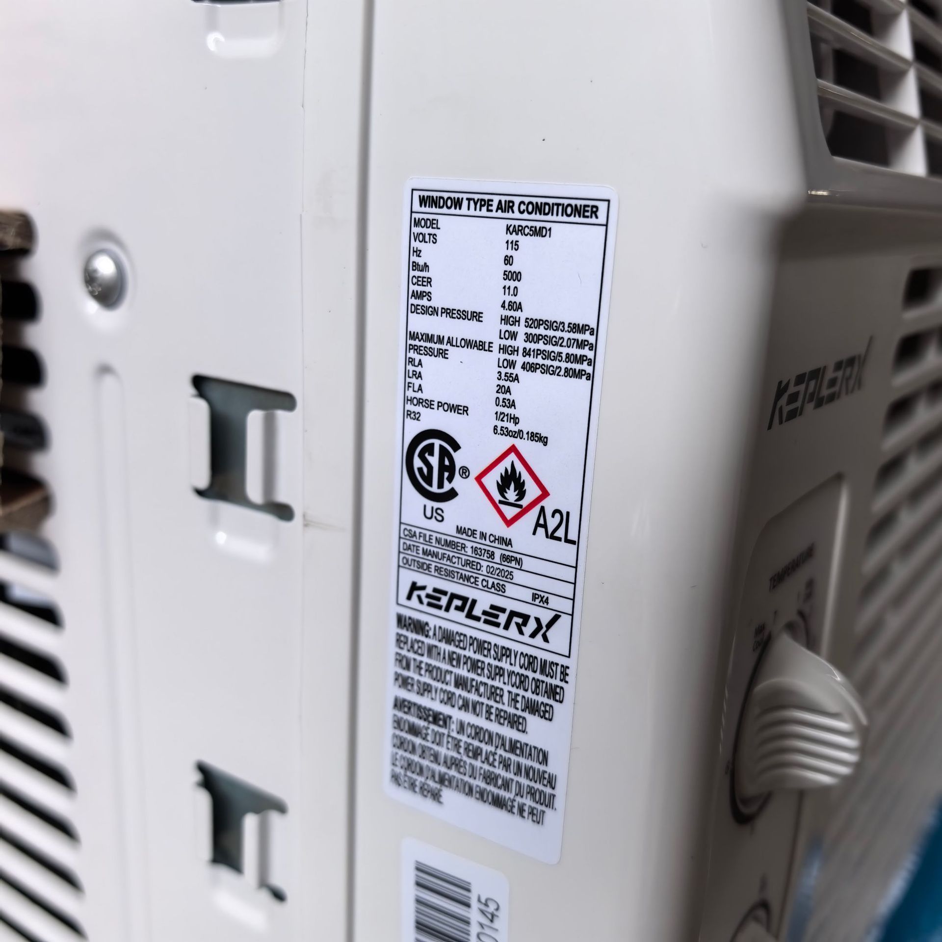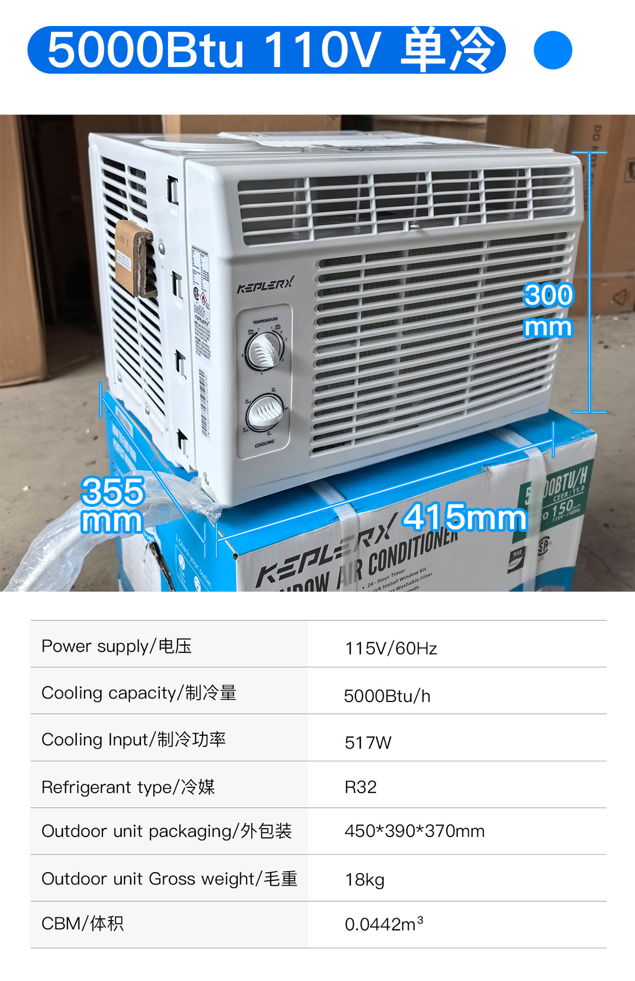 110V~60Hz, 5000 Btu, 1 HP, Single-Cooling Window Air Conditioner, R32