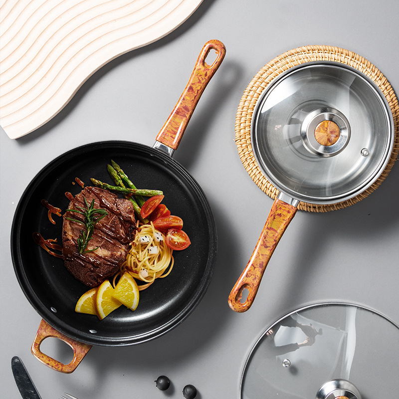 12-piece stainless steel cookware set with detachable wood grain handles