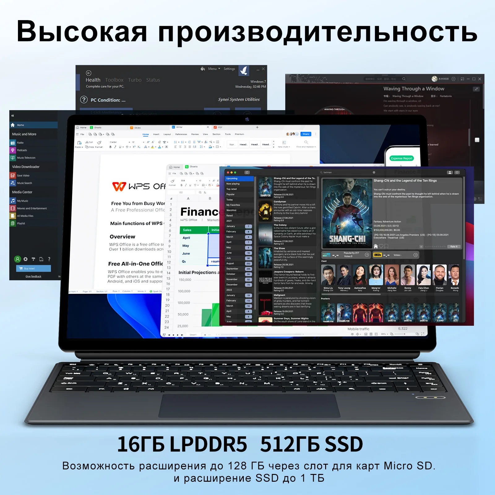 Tablet features a 14-inch 1920 x 1200 FHD IPS touch screen, which allows it to display text and images vividly. The 16:10 aspect ratio increases the display area of the screen. Using high-end in-line full paste technology, it provides clear and bright images. You can freely switch between laptop mode, tablet mode and display mode. Laptop And equipped with a detachable Bluetooth backlit keyboard.