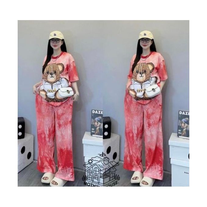 - Design: Both pieces feature a red and white tie-dye design. The t-shirt has a large graphic print of a teddy bear on the front.