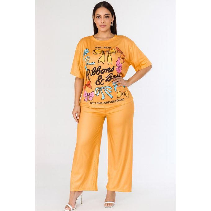 Bottom: The pants are yellow full-length, and appear to be a straight-leg or slightly tapered style. They contrast sharply with the yellow top.
