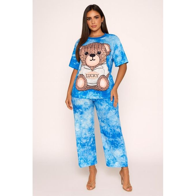 Top: Features a relaxed, oversized fit with short sleeves and a round neck. A large graphic of a teddy bear wearing a white shirt with the word “LUCKY” is printed on the front.