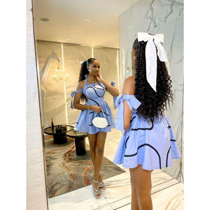 The woman is wearing a blue dress with black accents and a matching bow in her hair. The dress has a halter neckline, a short skirt, and a bow detail on the shoulder.