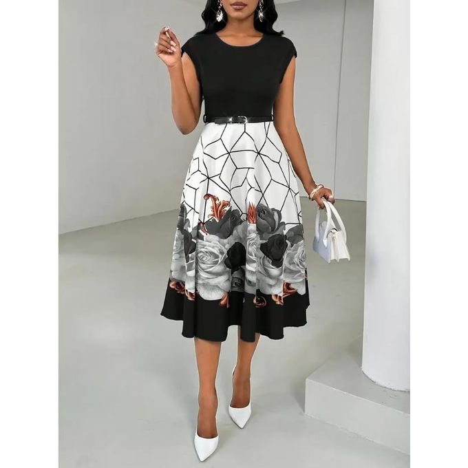 The lower skirt adopts an artistic rose printed patchwork. Black, white and gray roses are matched with geometric lines, showing a modern vibe in vintage charm. The flared skirt sways gracefully when walking, fully highlighting women’s gentle romance. Selected high-quality drape fabric is skin-friendly, breathable and not easy to deform. Whether for office commute, banquet party or daily shopping, it can make you stand out in the crowd and become an elegant focus.