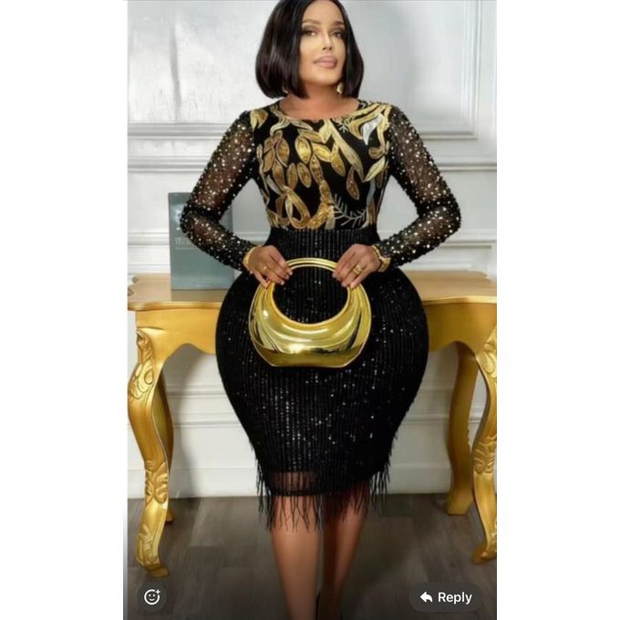 The dress appears to be a black, long-sleeved, knee-length dress with gold embroidery and sequins. The style is formal and elegant, possibly a cocktail or evening dress.