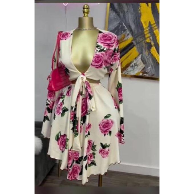 The dress is white with a floral pattern featuring pink roses and green leaves. It has a deep V-neckline, long sleeves, and a tie at the waist. The dress appears to be knee-length or slightly above the knee.