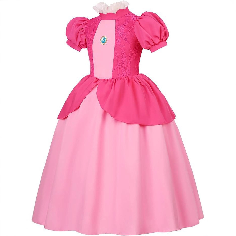 Girls' New Mario Cosplay Princess Peach Lace Splicing Puff Sleeve Dress