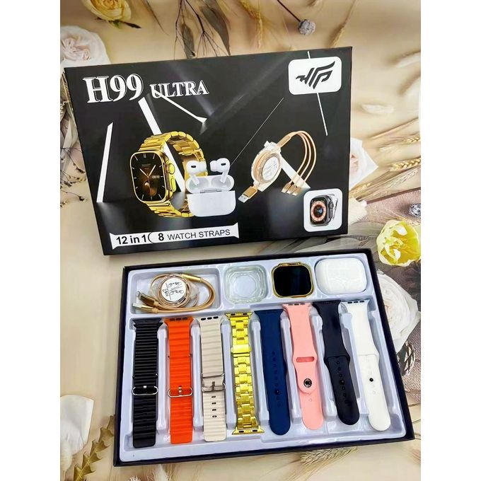 Experience luxury, performance, and versatility with the H99 Ultra Smartwatch 12-in-1 Combo Set. This premium package includes a smartwatch, 8 stylish watch straps, a pair of wireless earbuds, and a magnetic fast charger, making it a complete solution for your everyday lifestyle.