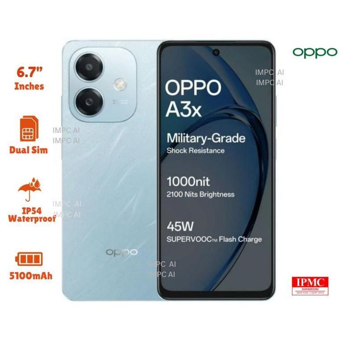 Oppo A3X Dual Sim – 6.67″ HD+ Panda Glass – 8MP Camera Rear/ 5MP Front – 64GB ROM – 4GB RAM – 5100mAh – IP54 Dust & Water Resistant – Ocean Blue 36 Month Warranty + FREE headset