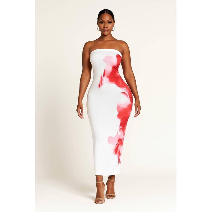 The dress shown in the image is a women’s white strapless bodycon maxi dress with a vibrant red and pink abstract or floral print.