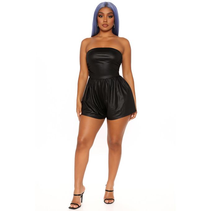 The item shown is a black, strapless jumpsuit or romper with a tube top style bodice and shorts. It features an elasticized or drawstring waist for a comfortable fit. The fabric has a sleek, shiny appearance, similar to faux leather.