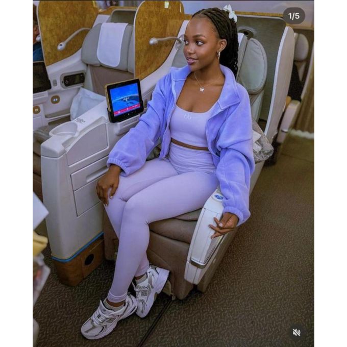 The woman in the image is wearing a lavender-colored outfit consisting of a cropped sports bra, leggings, and a matching jacket. The sports bra has a small logo on the front, and the jacket is open, revealing the bra underneath. She is also wearing white sneakers with gray accents. The overall color scheme of her outfit is predominantly lavender, with white accents on her shoes.