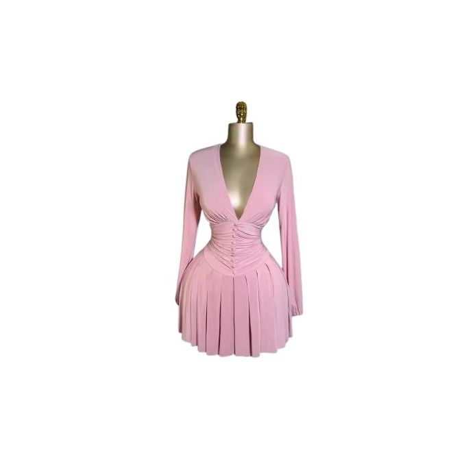 Women Pleated Button Bodycon Long Sleeve Dress – Pink