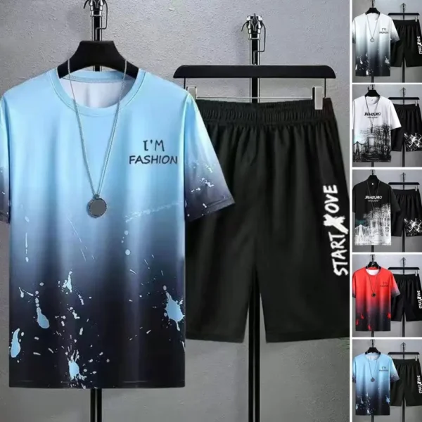 2Pcs/Set men Outfit O-Neck Short Sleeve Elastic Waistband T-shirt